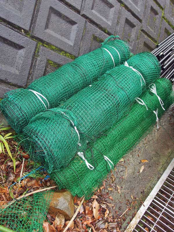 最初に張った新しいネットは2メートル巾(高さ2メートル)、補強に張った古いネットは1メートル巾(高さ1メートル)です。残っていた短いポールをネットの下部に斜めに打ち込んで更に補強しました。