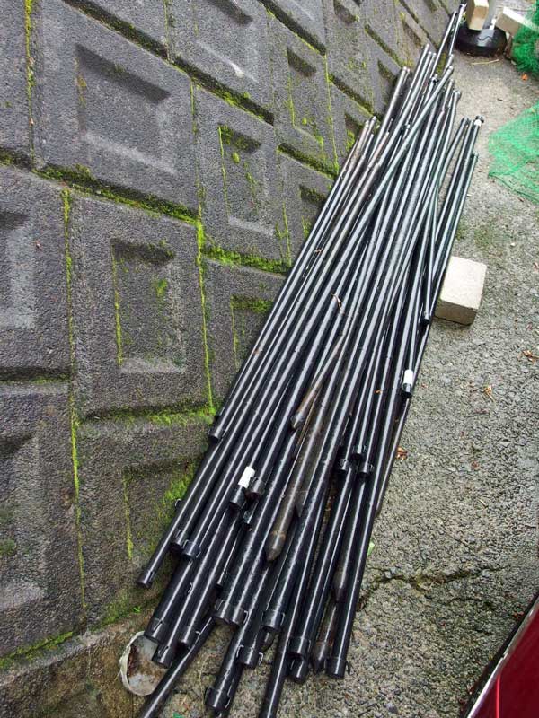 ↑引き抜いたネット用ポール、鹿や猪が体当たりして「への字」に曲がったのは捨てて、使えそうなのはまた使います。