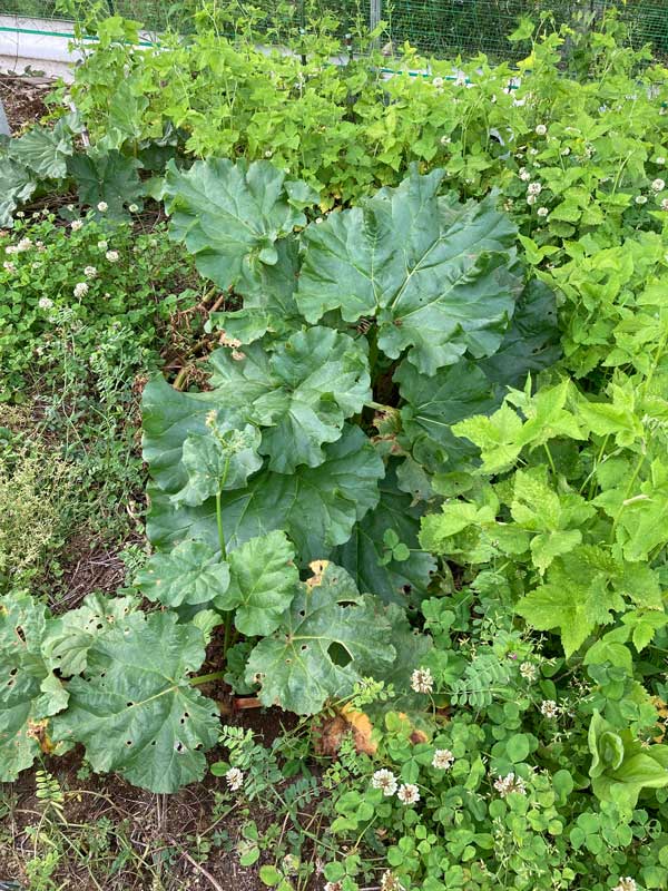 2区画借りている日当たりが悪い方の畑、ここには日陰でも元気な野菜を植えています。三葉、ルバーブ、フェンネル、、、 昔サラダミックスを育てた時の生き残りのチコリ。