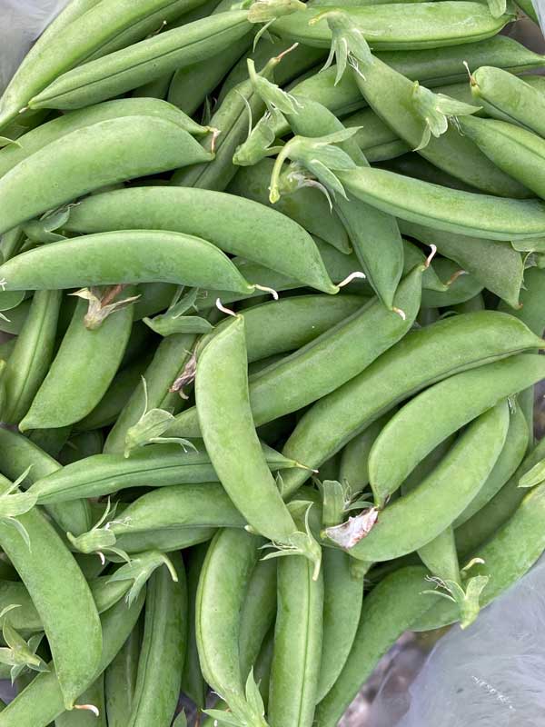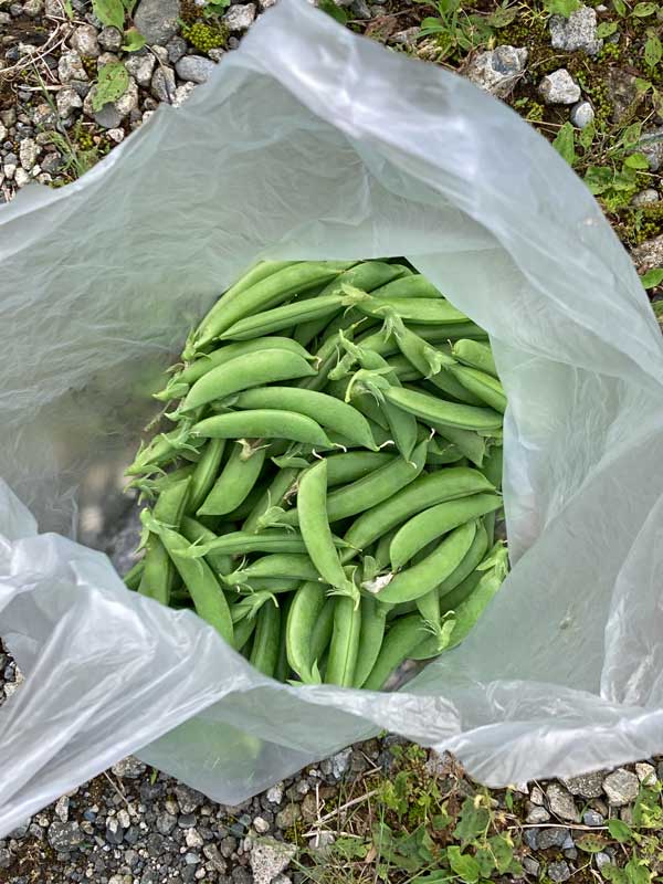 採れたのは、三葉、スナップエンドウ、ルバーブ、
