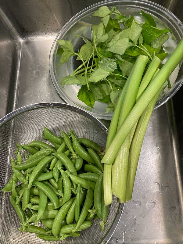 夕方菜園からスナップエンドウ、三葉、ルバーブを採って帰った私は、翌日のお客様のメニューを組みなおしました。