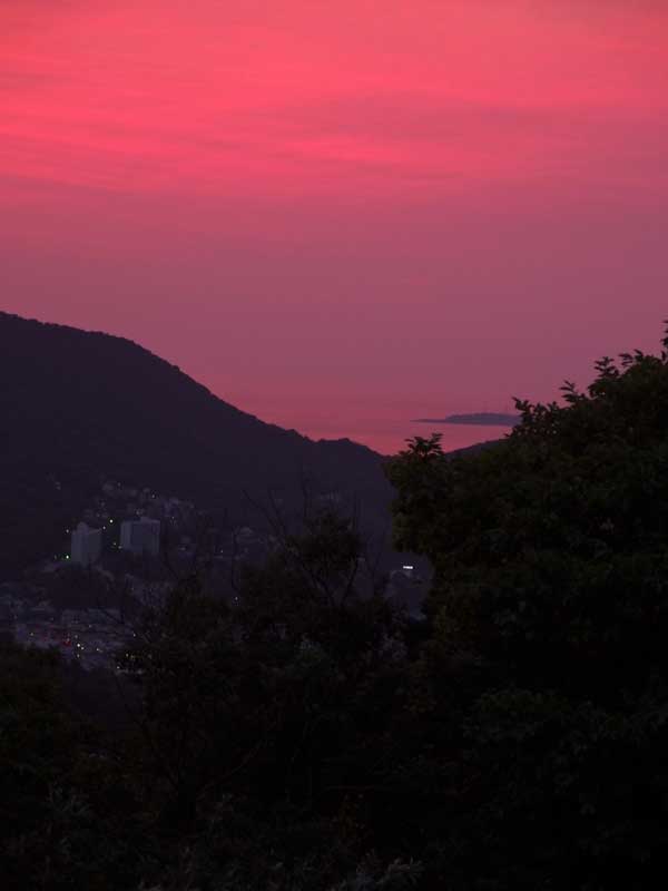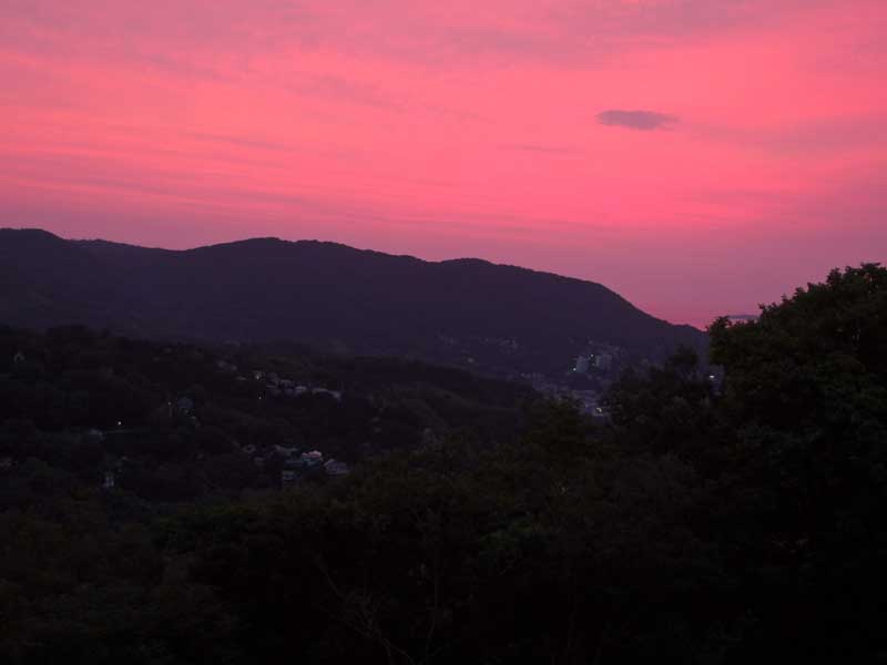 梅雨で湿気の多い空気、その湿気に朝焼けの色が反射しているよう