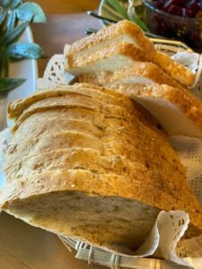 "アマゾンエコー’をセットし直していると、スタッフの方がお茶とおしぼりを二人分お盆にのせて持って来て下さいました。私は持って来たサンドイッチとお菓子を側に置きました。