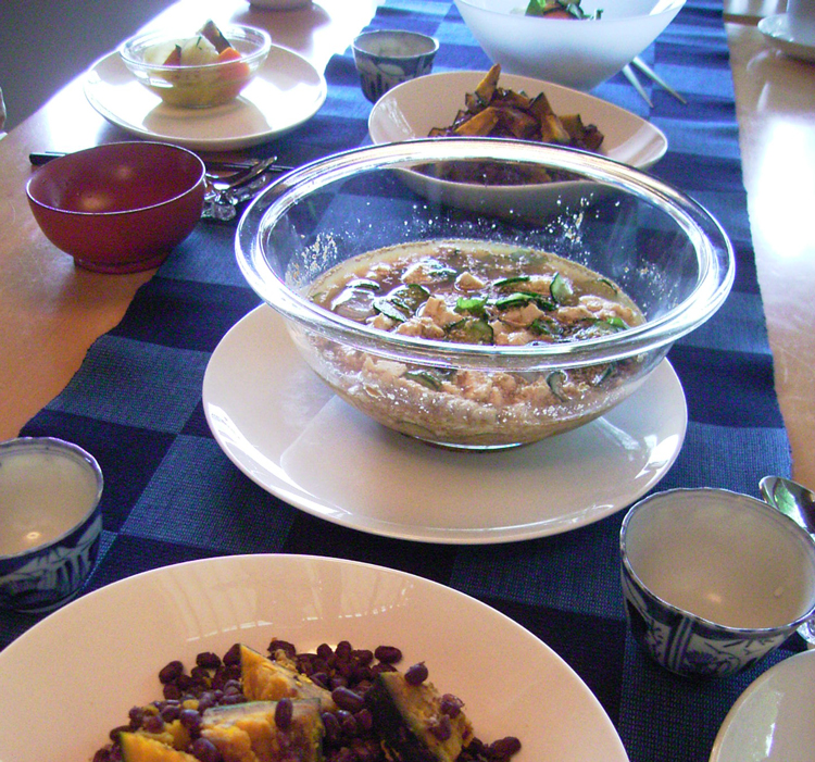 写真は2年前の夏に開いた 「基本の基本」 というマクロビオティックの料理教室のテーブルです。 当時はリクエストに応じてマクロビオティックをお教えしていました。 この時は暑くて何も作りたくないという方向きに、最低の努力で、元気に夏を通過できるメニュー。 冷汁、小豆南瓜、野菜の一塩、保温鍋で作る陰陽を調えるスープ、保温鍋で炊く玄米ご飯でした。
