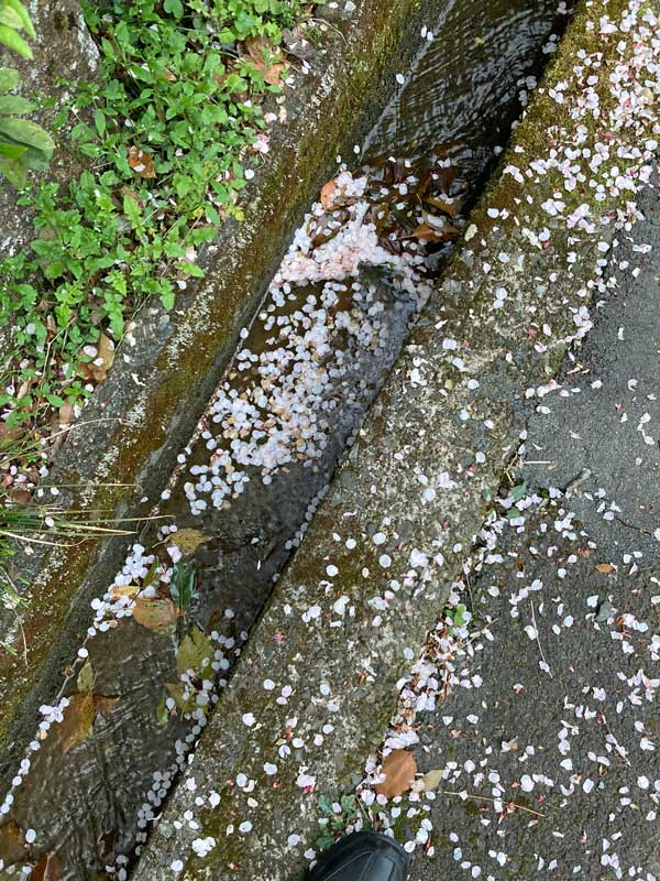 湧き水の流れる側溝にも花びら・・・ 静かで幸せな私ですが、ちょっぴり残念な思いが今胸の中にあります。