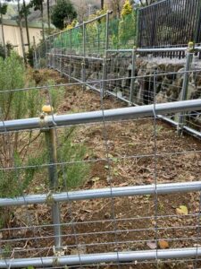 補強の支え棒の取り付けは未だですが、とにかく敷地の周りを隙間なく金属柵で囲み、柵が地上と接する部分にはアンカーが打ち込まれました。この工事が終了した日の夜から鹿も猪も入って来なくなり、私は獣の気配で夜中起こされる事無く眠れるようになりました。