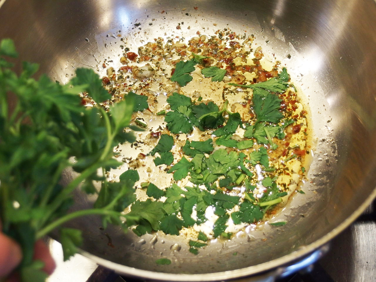 ニンニクの香りが出たら火を止め、パセリを切りながらいれます。