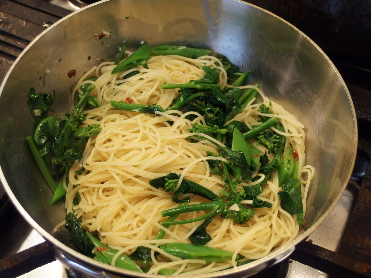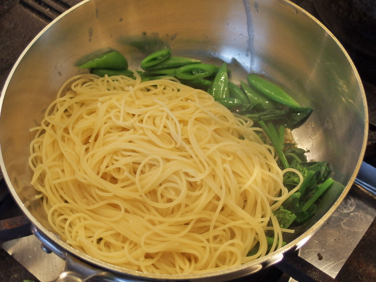 → 生の菜花やスナップエンドウを使う時は、茹であがりの時間の3分ほど前にパスタの鍋に入れて一緒に茹でます。