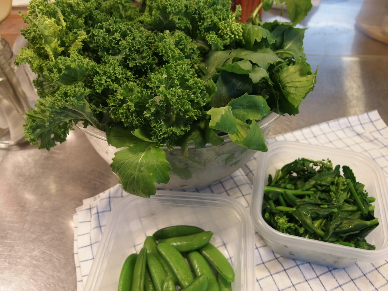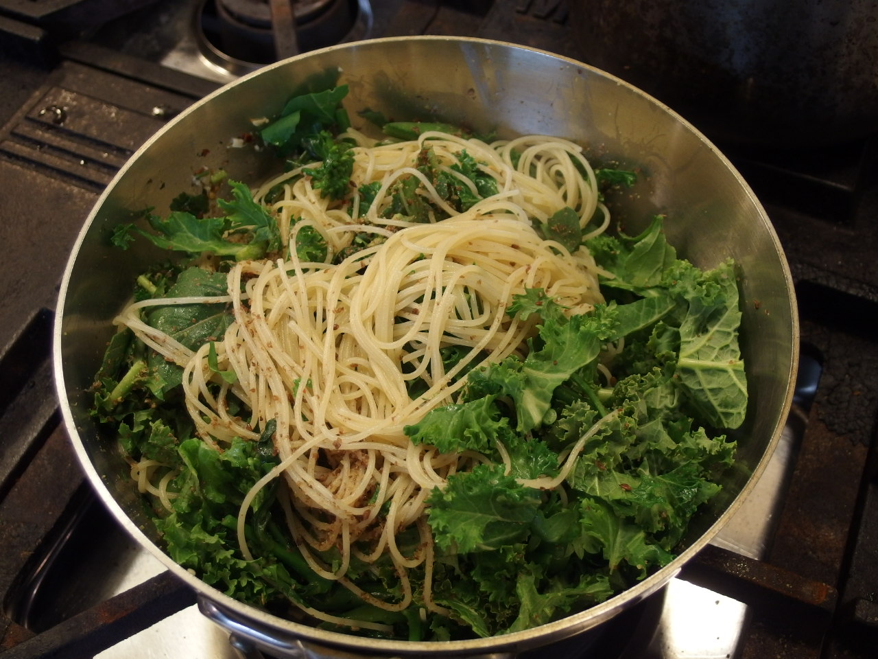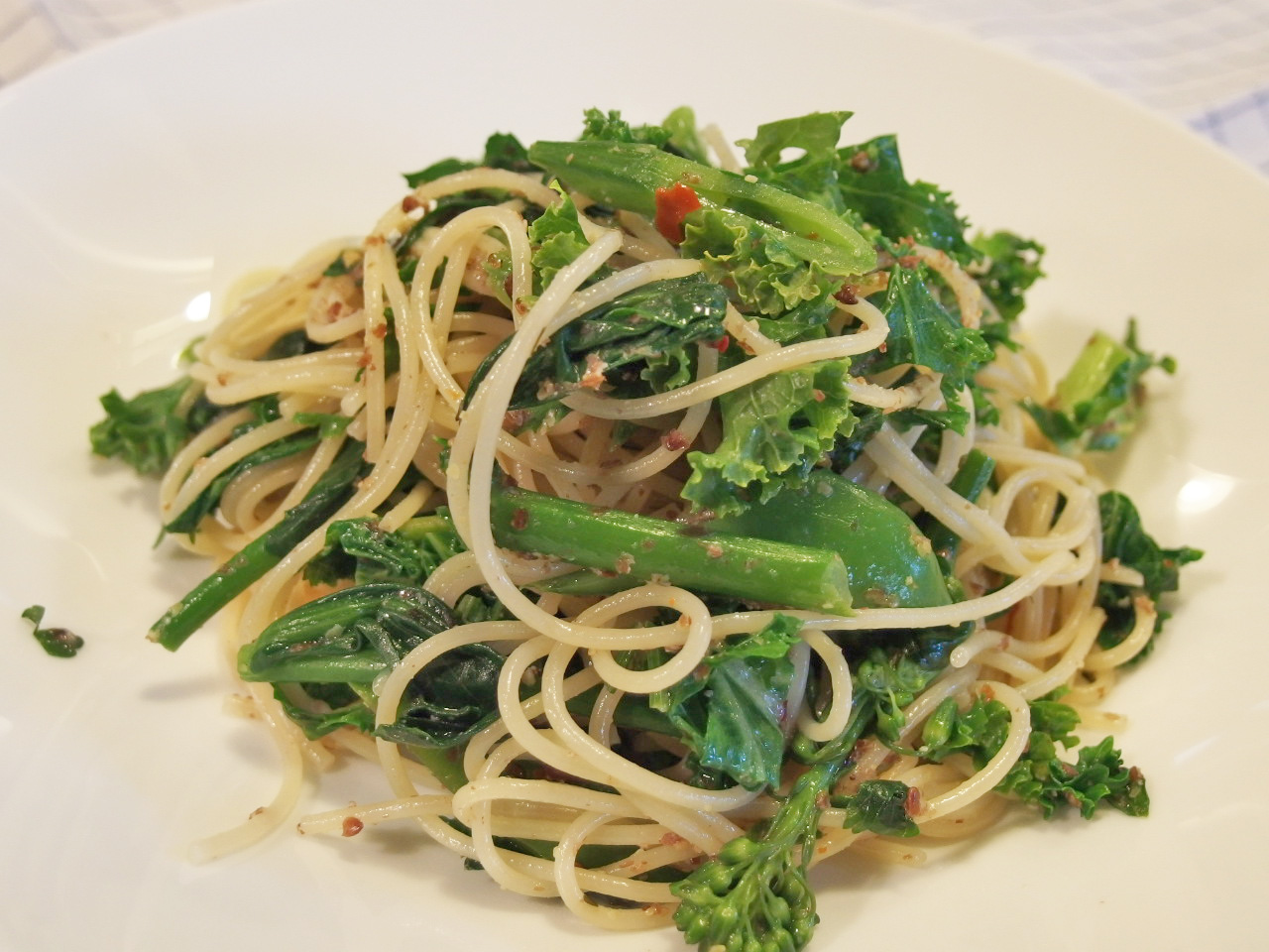 今日は冷蔵庫にあった、茹でたスナップエンドウとキャベツの菜花、それに生のケールとルッコラのアリオリソース・パスタにしました。 落合務さんの「野菜が主役のパスタ」にフラックスシードを入れるのがあったのを思い出して入れてみたら大成功。ルッコラやケールの苦みとフラックスシードの旨味が美味しい、大人の味のパスタになりました。
