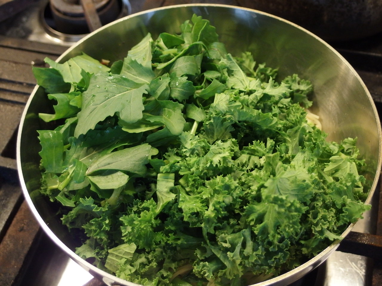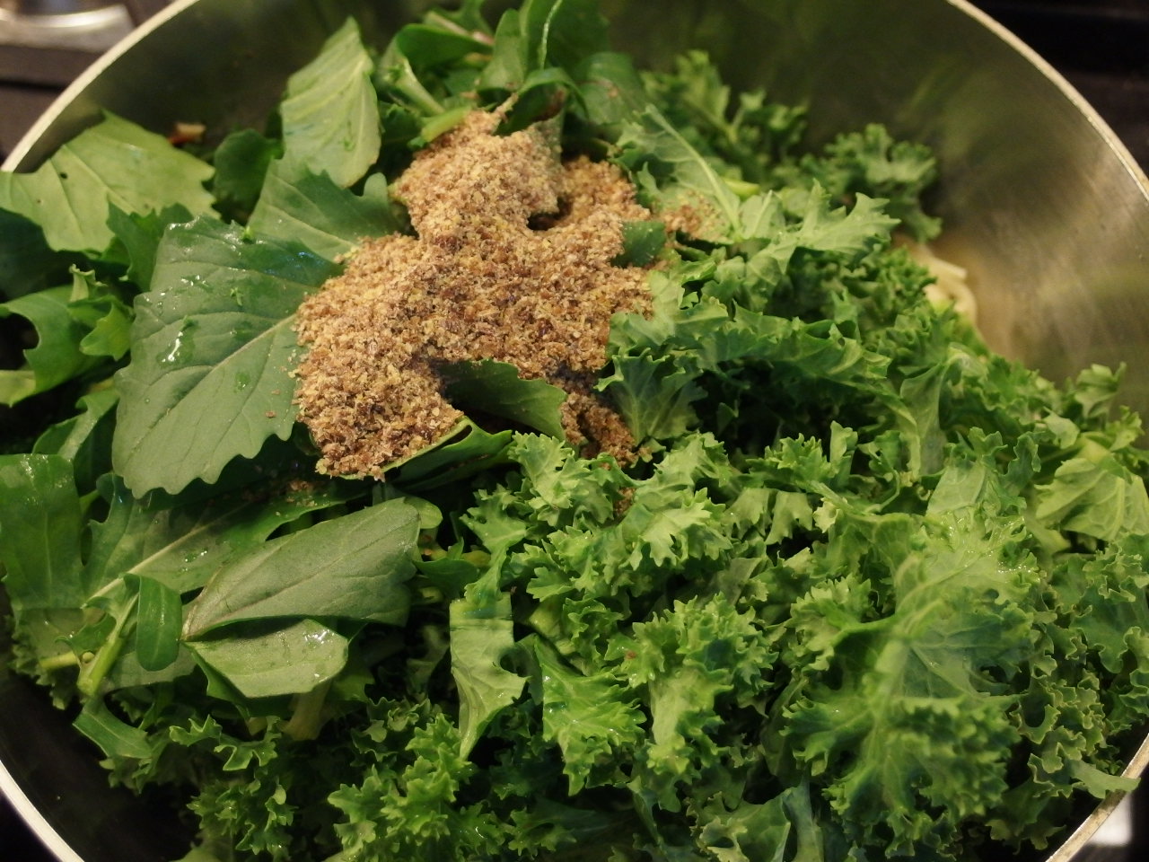 4、茹で上がったパスタをザルにあけ、2の鍋に入れソースをからめ、その上にケールとルッコラ、フラックスシードを入れ、よくかき混ぜて、お皿に盛ります。