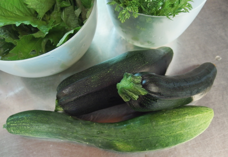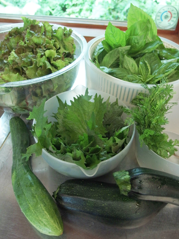 胡瓜を採ってから、レタスやハーブを摘みました。