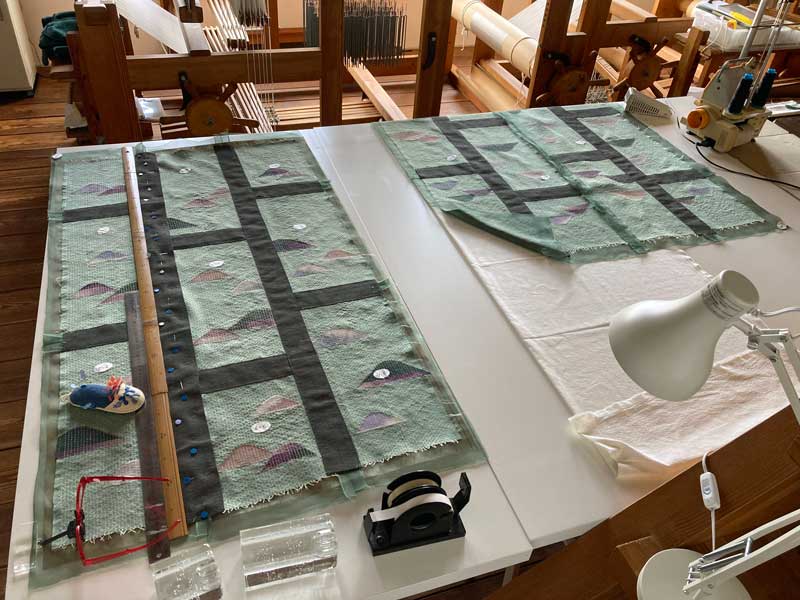 原寸大に寸法を書いた紙の上に袈裟のユニットを置いて、ずれや歪みを補正しながダマシダマシ寸法通りに納め。待ち針を打ちシツケで止めて行きます。