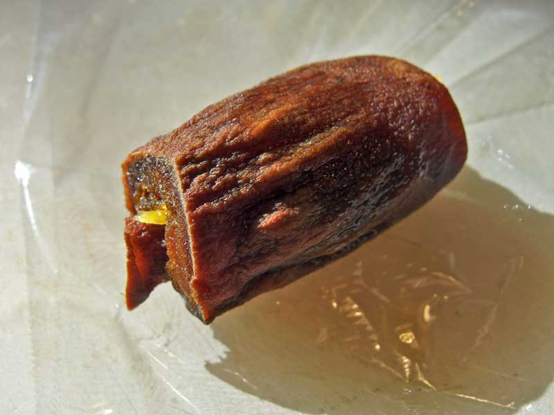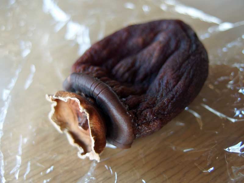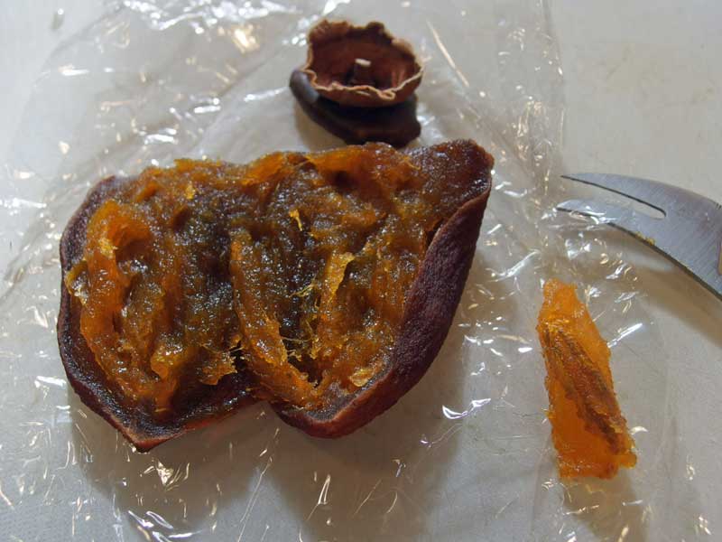 奥様がご主人と一緒に皮をむき、軒先で干したもの。伺った時も軒先に物凄く大きな柿がぶら下がっていました。それが干すとこの位の大きさになるのです。