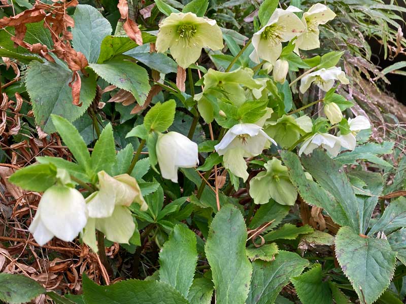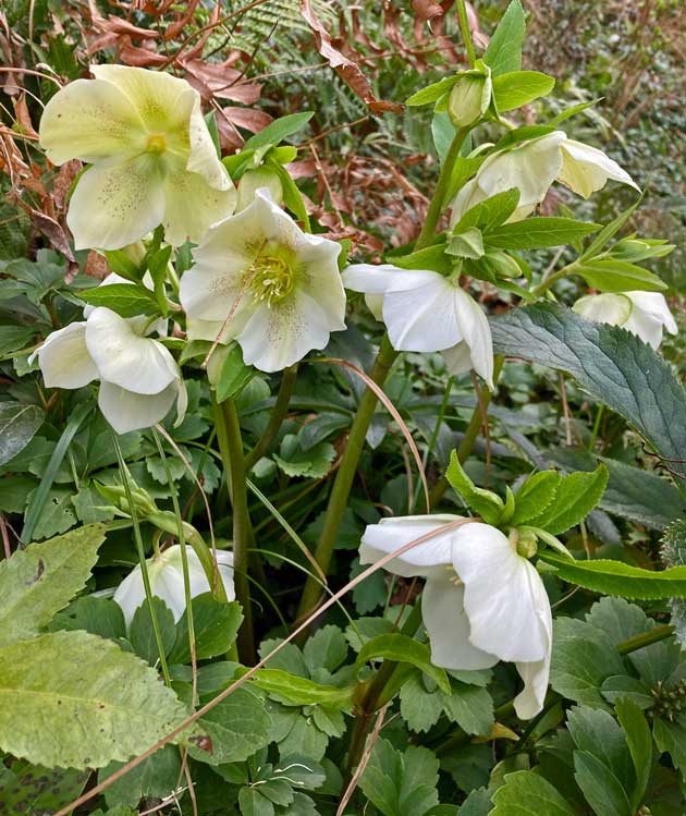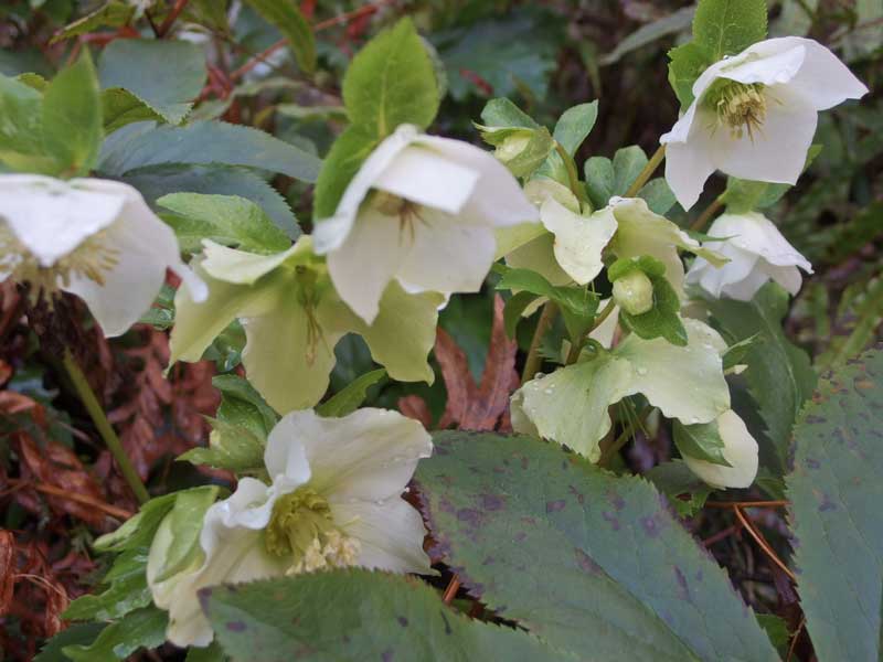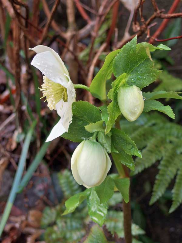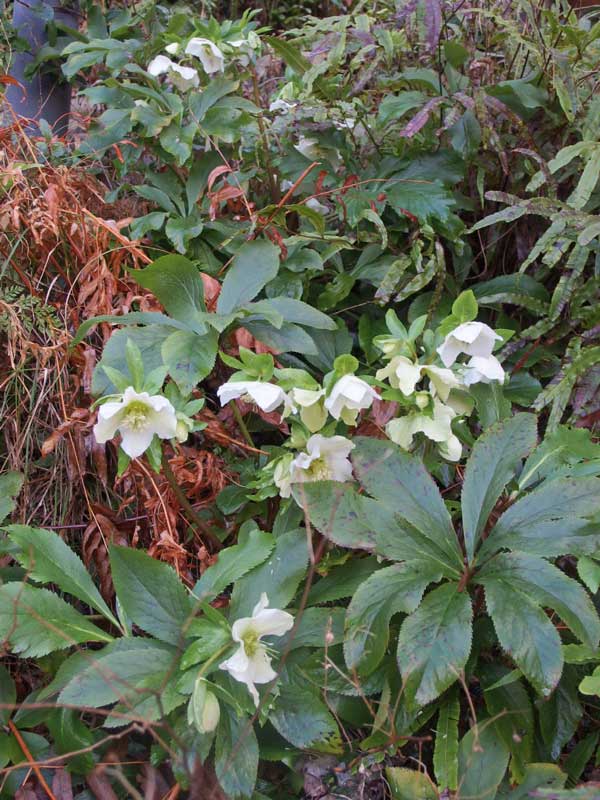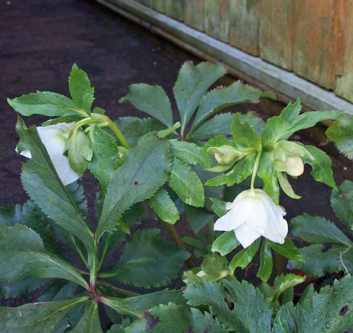 勝手口の下のこの白いクリスマスローズは、もっと上に植えたものの”こぼれ種”。