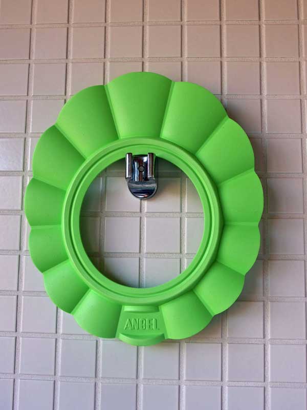 子供の頃の記憶に、ビニールを金属の輪に貼りつけたシャンプーハットがあるのですが・・・ 今はこんなオールインワンの作りなのですね、鮮やかなカエル色です。