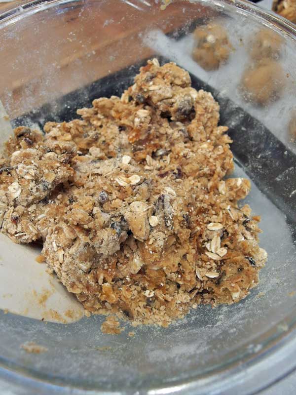 タネはこんな感じ。材料はオーツ、カムット粉、薄力粉、アーモンド粉、ショートニング、バター、てんさい糖、卵、干し柿、干しスグリ、デーツ、柚子皮、オールスパイス、バニラ。