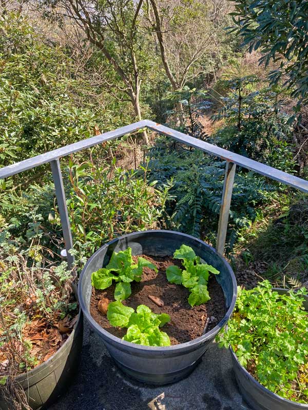 必要な時葉っぱを3枚4枚と採れるよう、畑でなく門の近くの植木鉢に植えました(目に水やホコリが入らないように防災用のゴーグルをかけて作業)。