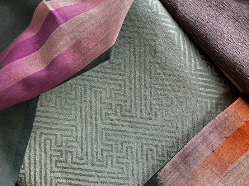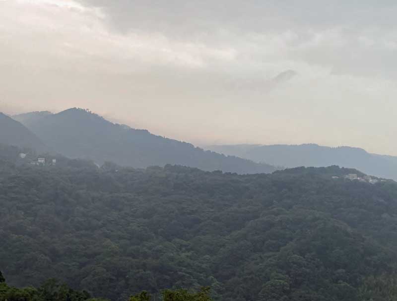 あれこれ考えていた時ふと外をみると、夕暮れの山がグラデーションで霞んで見えました。あまりの美しさにワンショット。そして私はこのイメージで遠山の糞掃衣を作る事に決めたのです。