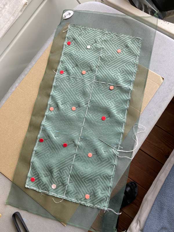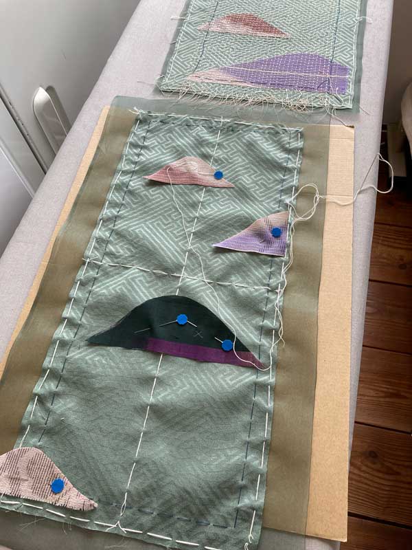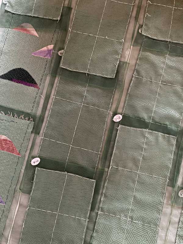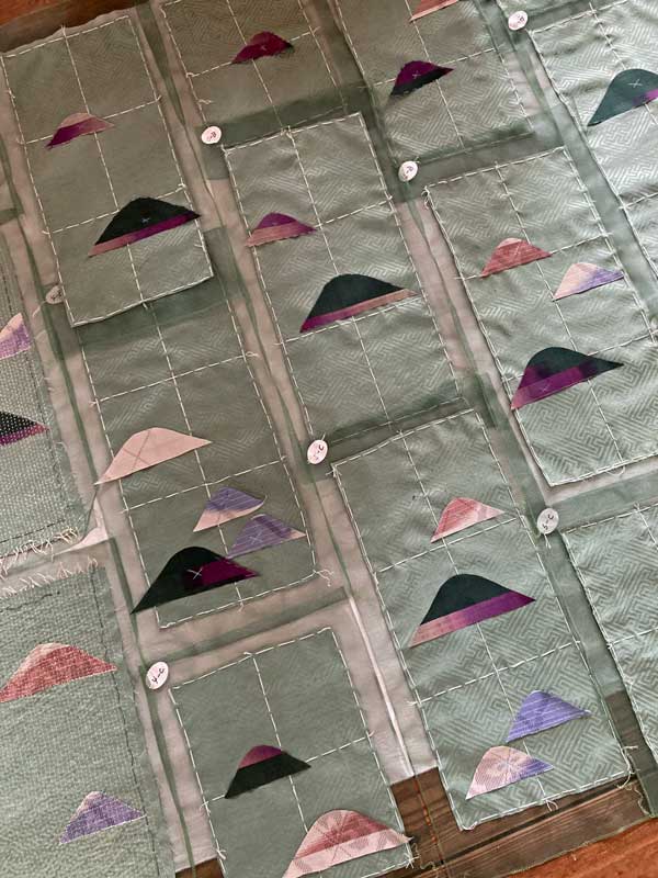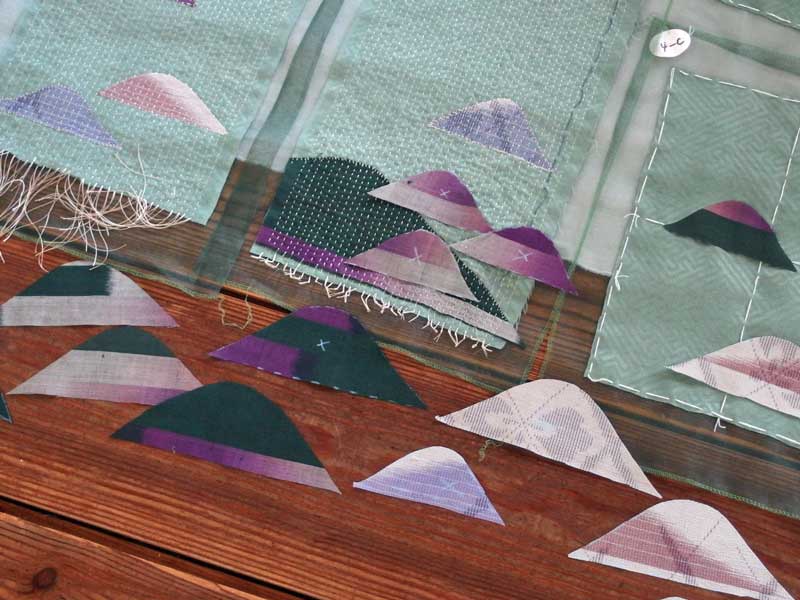 最初にサンプルとして縫ったユニットも、目立たない位置に使う事に決め、バランスを考えながら山型布を置いて位置を決めて行きます。