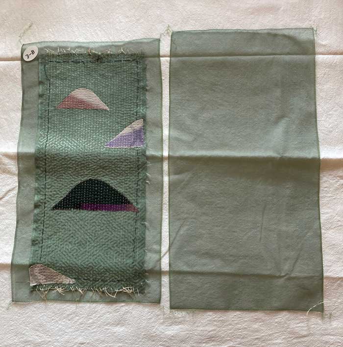 刺し子縫いするうちに、芯地のシルクオーガンジーの周囲がほつれてしまい、ロックミシンをかけたらご覧の様に一回り小さくなってしまいました。