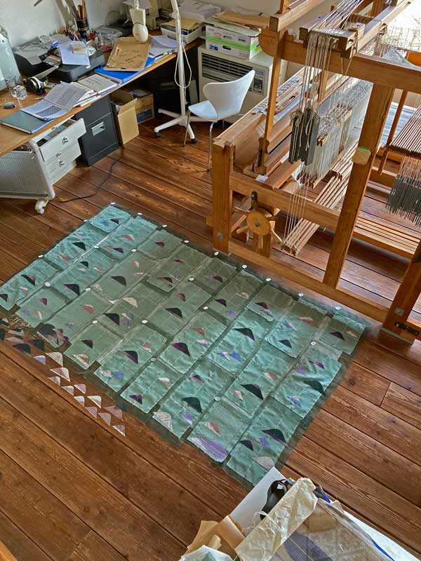 それをアトリエの床に出来上がりの位置に並べて、山形の布を散らす配置を考えました。