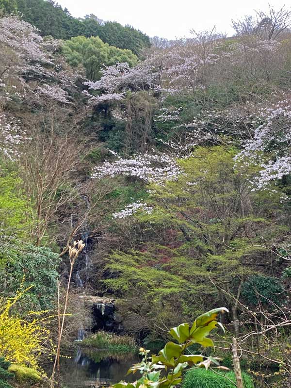散歩道の途中にある、滝と池のある公園から見上げた山・・・
