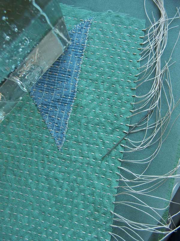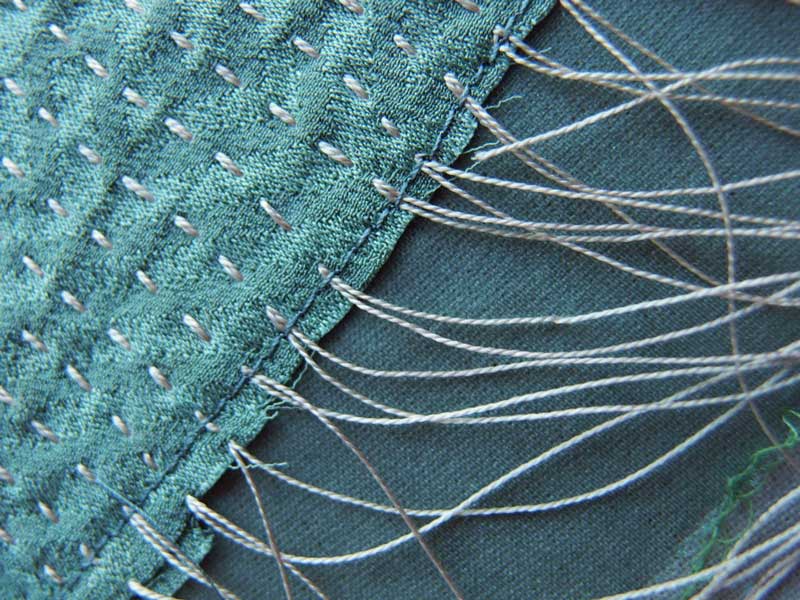 上から下へでもその逆でも1筋刺し子縫いしたら、糸の端は1cm前後余裕をもたせて結び止めする、これは縫い上がった後のアイロンで伸びる時の余裕との事。