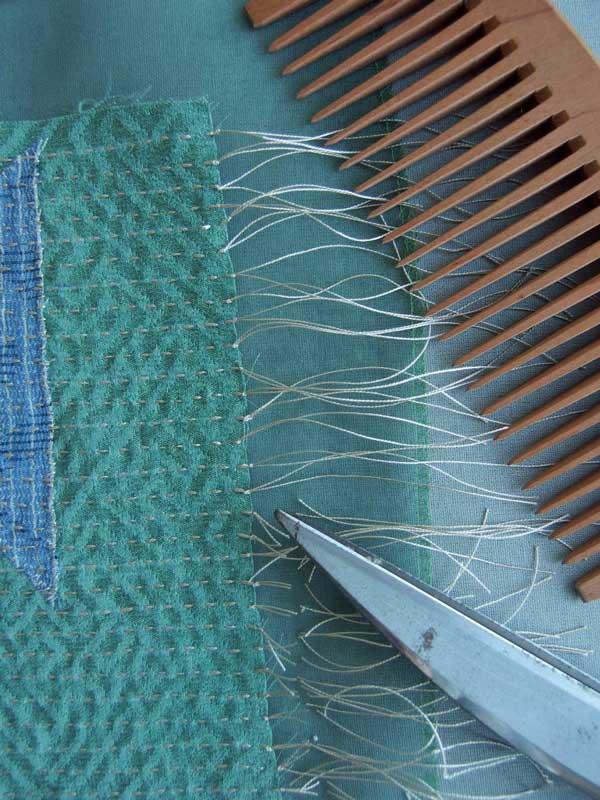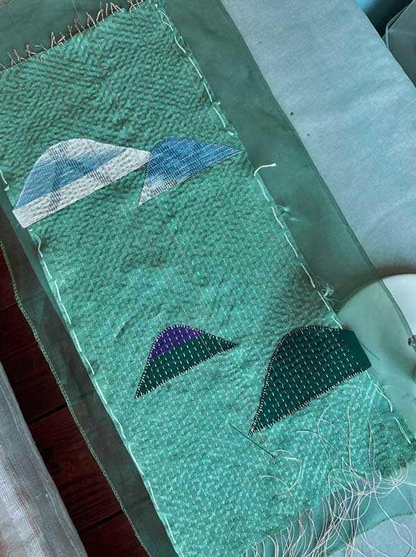 結ばない下端の写真がこれ↑だけなので追加の説明です。これは最初に刺し子したユニットで縮んで小さくなり過ぎて布端をミシンで押さえてあります。