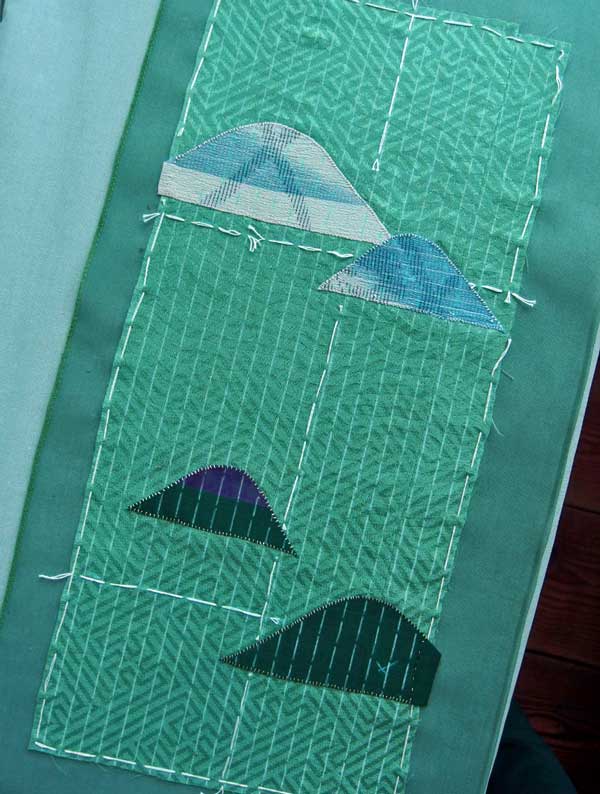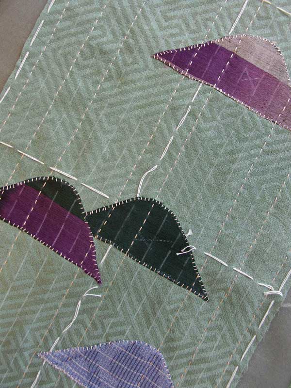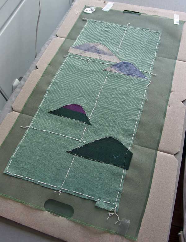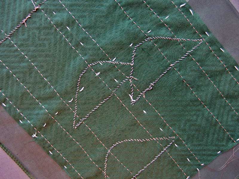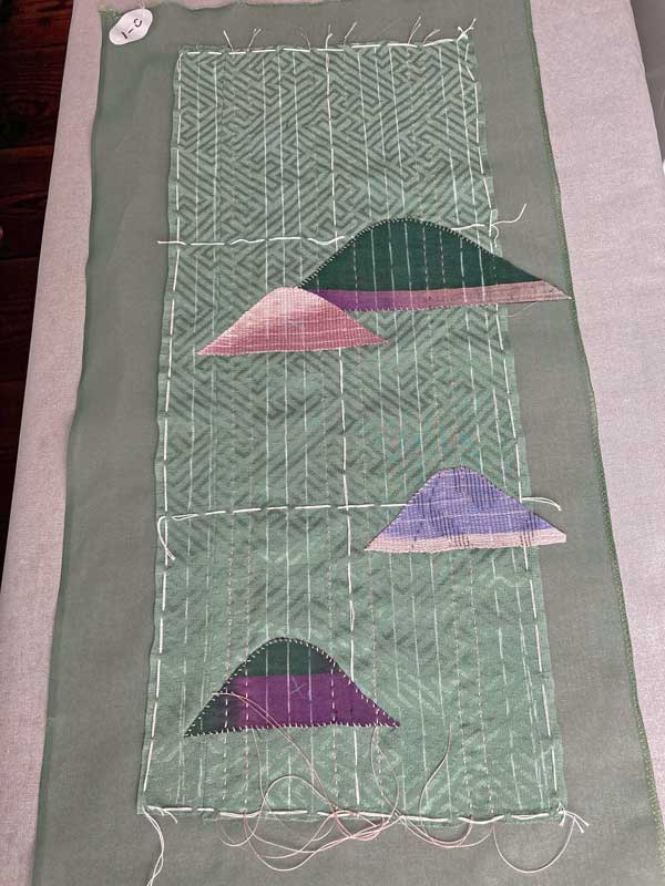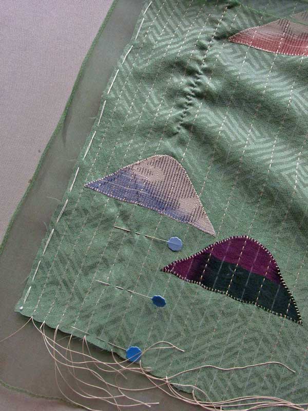 表地の卍綸子を芯地のシルクオーガンジーと重ねてシツケで止め、その上に散らす山形布の位置を決めたら、いよいよ刺し子縫いに入るのですが、その前にもうひと仕事あります。