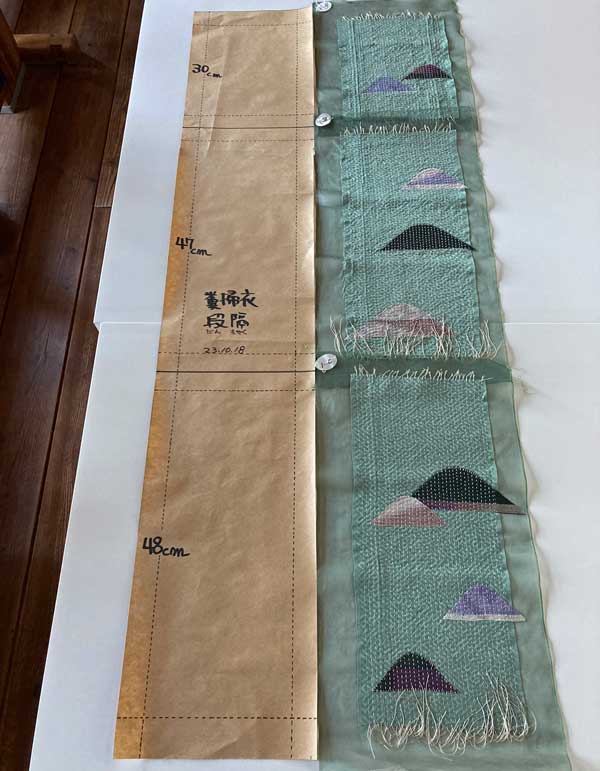 刺し子縫いが終ってから1か月間、縫い糸の片端は結ばないでそのままにして、自然に縮むのを待ち、出来上がり寸法の型紙と並べて大きさを確認。