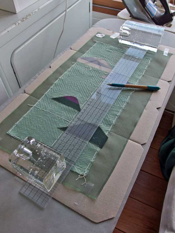 山型布をくけて固定したら、刺し子縫いのための線を引きます。先ず裏からアイロンで押さえて布の歪みをならし、硬めの段ボールの上(チャコで線が引きやすい)に表を上にして広げ、布が動かないように四隅をテープで止めます。