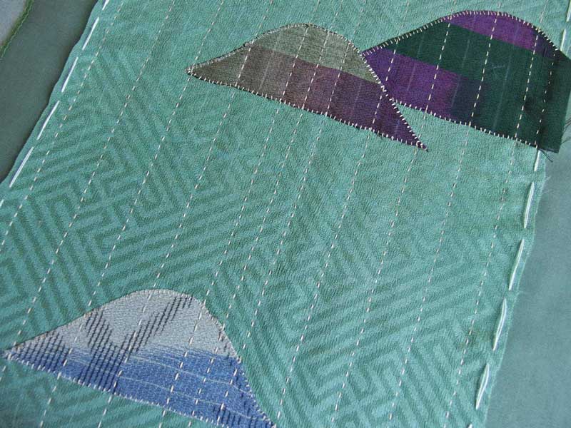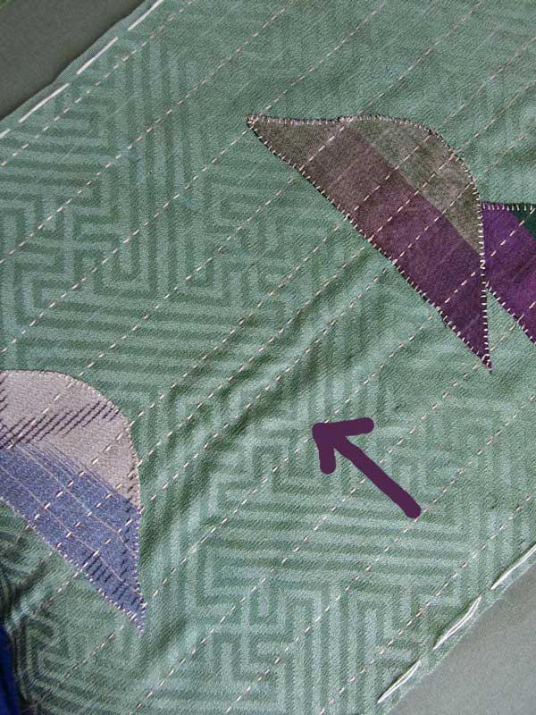 刺し子縫いを進めて行くと、手指の湿気で表布の綸子が伸びて、このようになって来ます。