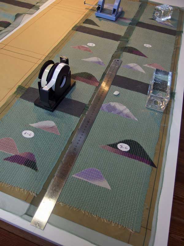 「条」を繋ぎ合わせた状態の原寸大の型紙を作り、その上に縫い合わせた「条」をのせて、寸法通りに出来上がるよう縫い合わせる”縫い線”の微調整をします。