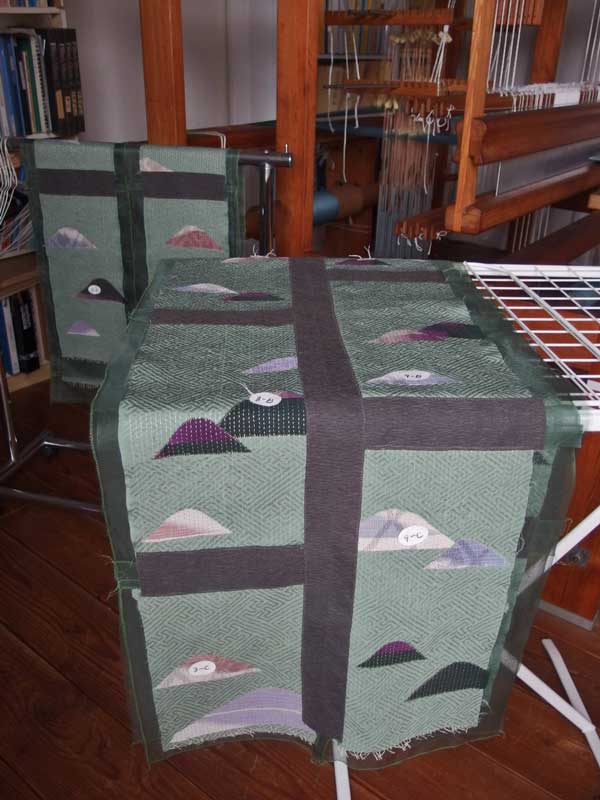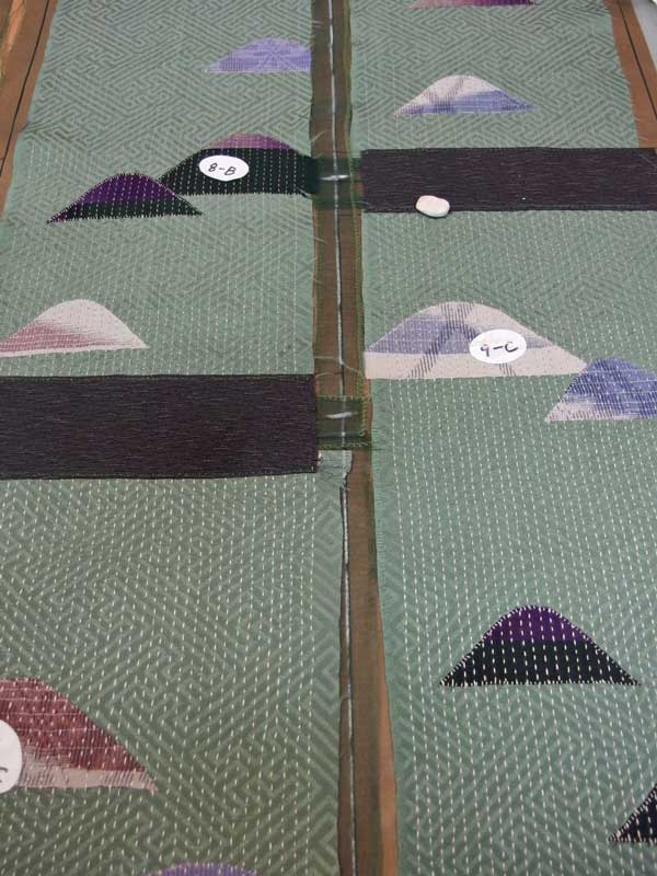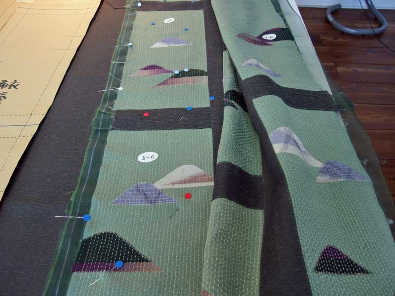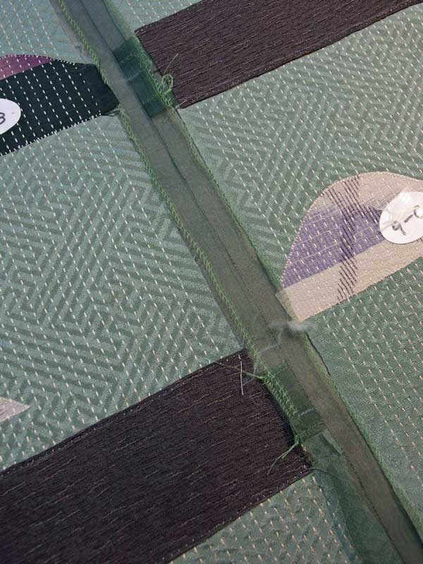 縦方向にユニットを3枚縫い合わせ、縫い目と縫い代を隠す様に「葉」と呼ばれる細長い布を縫い付け、縦長の布「条」が出来ました。次はこの「条」を緯方向に縫い合わせて行きます。