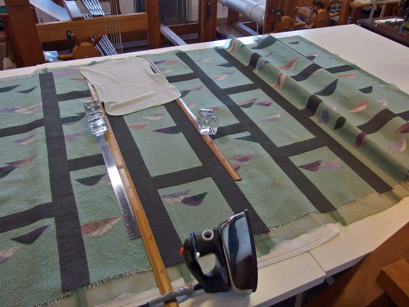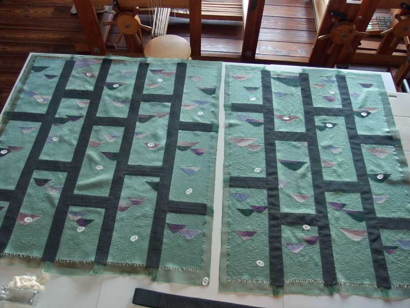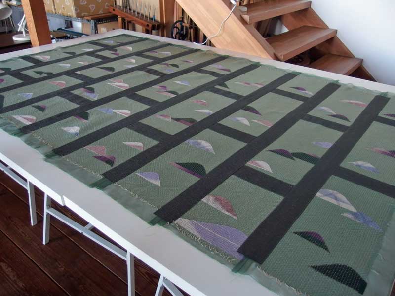 最後の縫い合わせが終り、その縫い目に細長い「葉」を被せ、一針一針返し縫で止めるのが大変でした。手縫いする部分が布端から1m以上あるので、大きな作業台の上に袈裟をのせ、縫う部分の作業がし易いよう袈裟の下に高さのある箱を置いて行いました。