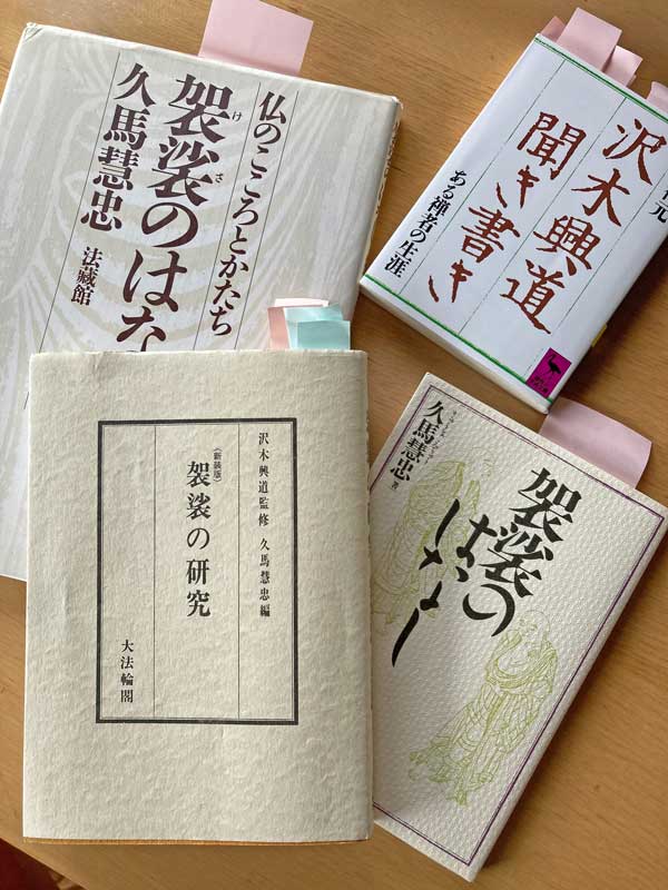 私が袈裟縫いのテキストにした本、この中心になっているのは「袈裟の研究」沢木興道監修・久馬慧忠編です。