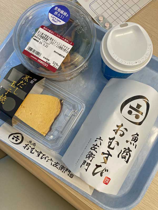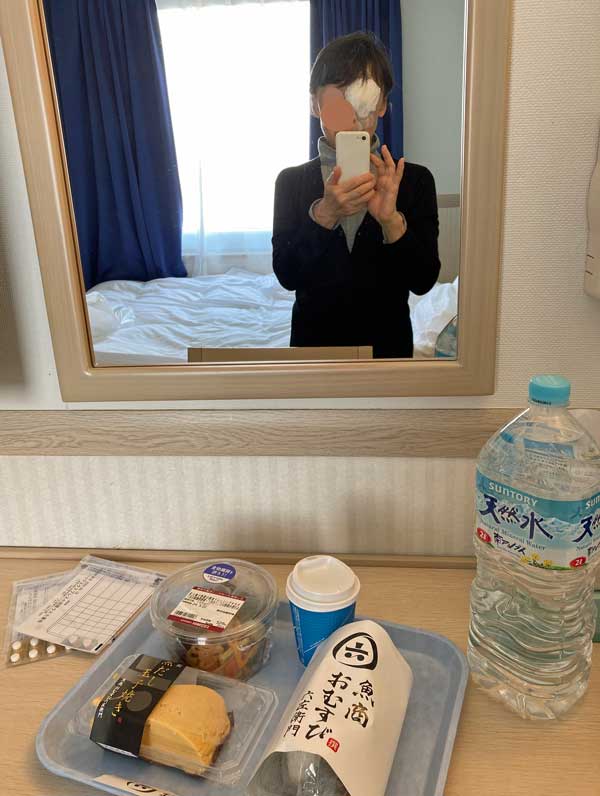 最初の左目の手術の後は、ホテルまで帰るのが大変でしたが、今回は良く見える様になった左目が安定していたので楽に歩けました。途中で立て看板にぶつかる事もなく”おにぎり屋さんでおにぎりと卵焼きを買って、無事ホテルに戻れました。