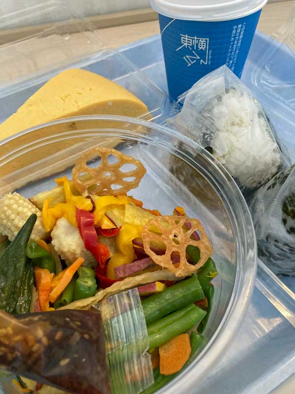 塩にぎり、卵焼き、揚げ野菜のサラダ! 全部食べられると思ったのですが、おにぎりは1つで、卵焼きも半分で、充分でした。残りは夕食に廻す事に。