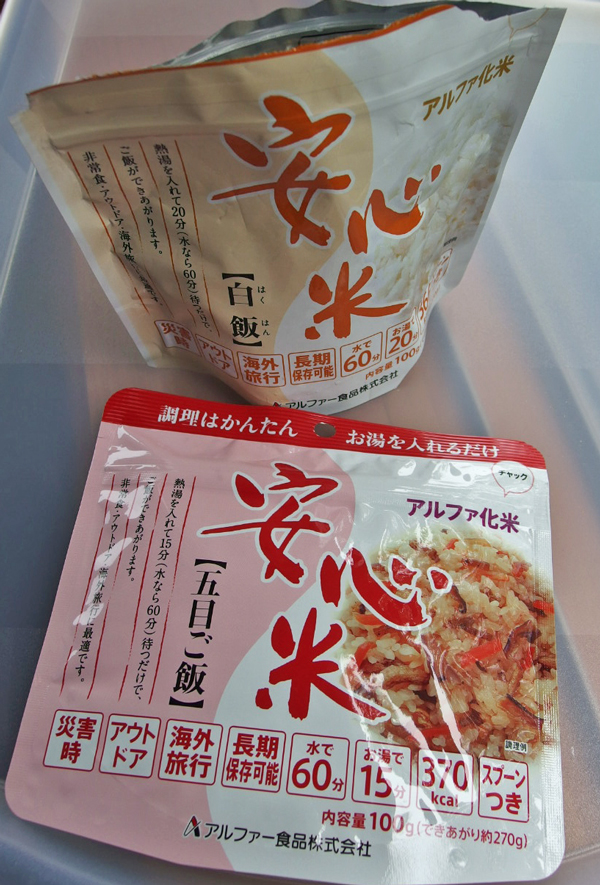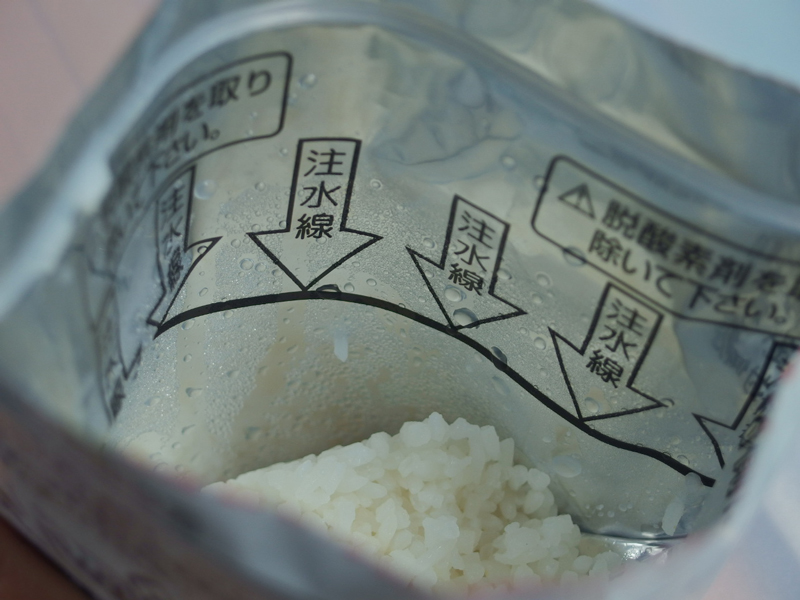 袋を開けるとプラスティックのスプーンまで入っていて、先ずそれを取り出し、酸化防止剤の小袋も取り出し、お湯か水を矢印まで注ぎます。 封をしてお湯なら20分待つと、ホカホカのご飯の出来上がりです。 ご飯はちょっとポソポソしていますが、水さえあればご飯が出来る、お湯があれば温かいご飯が食べられる、すごいな~と感心してしまいました。 どんな時もご飯を食べれば、元気が出てきます。 5月4日のブログに書きましたように 「ごはんはご飯」 なのだと思います。