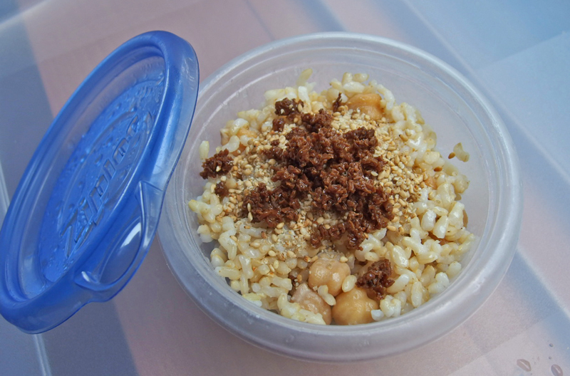 保存容器に入れた豆入り玄米ご飯に、白胡麻をふり、ベジタリアンの時雨蛤と自分で呼んでいる生麩の醤油漬けのミンチをのせたものです。 5月29日のブログに書きましたように、炊いたご飯はこの容器に入れて冷蔵庫にいつもあるので、お弁当にする時は軽く電子レンジで温めてフリカケをのせるだけです。 これが1個一体いくらで出来るのか材料費だけですが計算してみました。