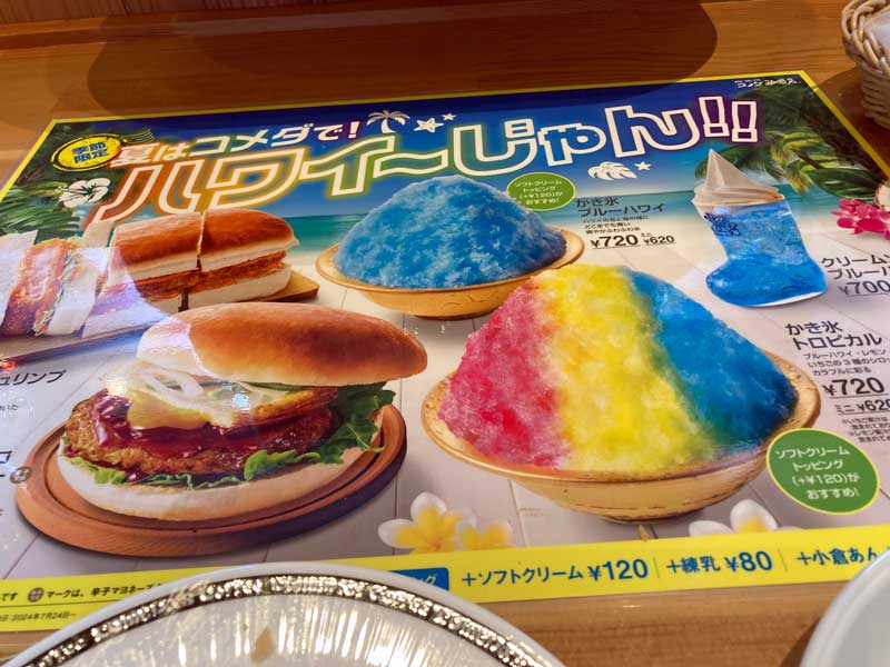テーブルの上には夏季限定のかき氷のメニュー。スゴイ色! メニューをよく読むと「シロップには苺は含まれていません」とあります。人工の色と味の世界です。