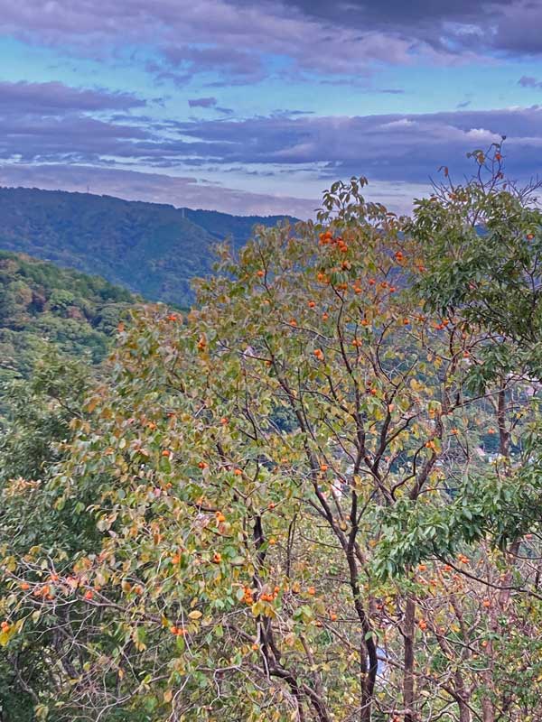 実が沢山ついた柿の木の向こうには、寒そうな紫色の雲がたなびいています。