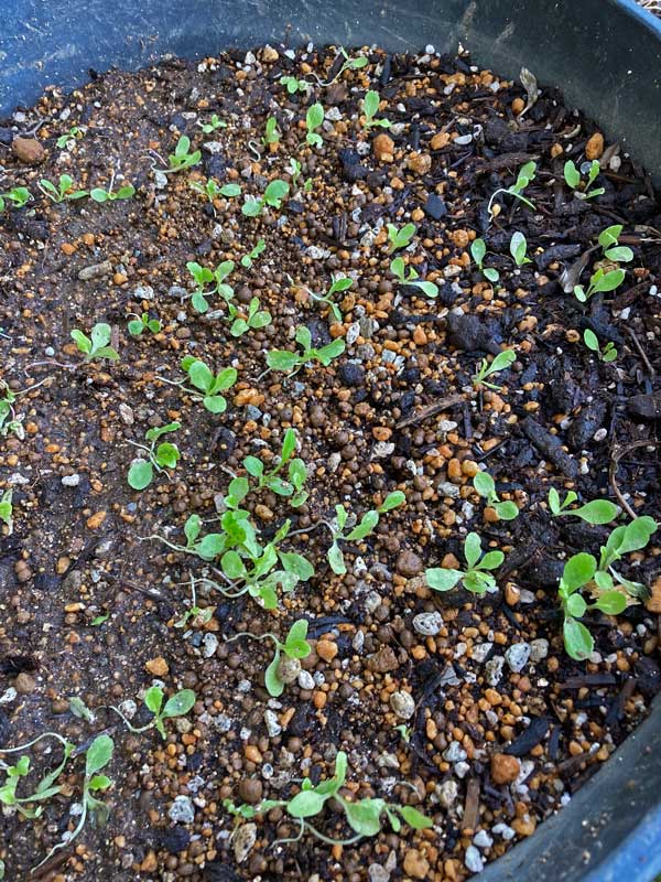 蒔いた種は全て3日で発芽しましたが、植木鉢の上に覆いかぶさる隣地の大木で太陽が遮られ、雨が木の枝を伝わって落ちるので土がえぐられて、このような状態。