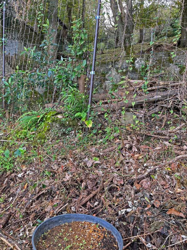 植木鉢を置いた場所の上南側は、こんな急斜面、そして隣地の大木が我が敷地に被さっているのです。