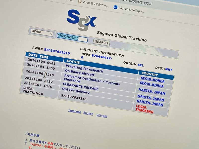 翌日にはそれが韓国まで送られ、6日に成田に到着。数時間で税関を通り、7日には国内配送へと。