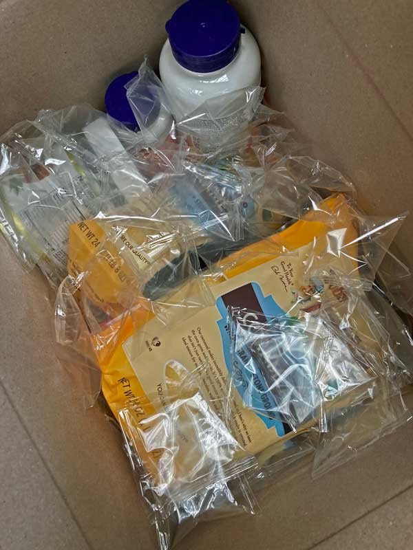 大きな箱の底に並んだ注文品の上に、おまじないみたいにエアークッションがパラパラまかれています。