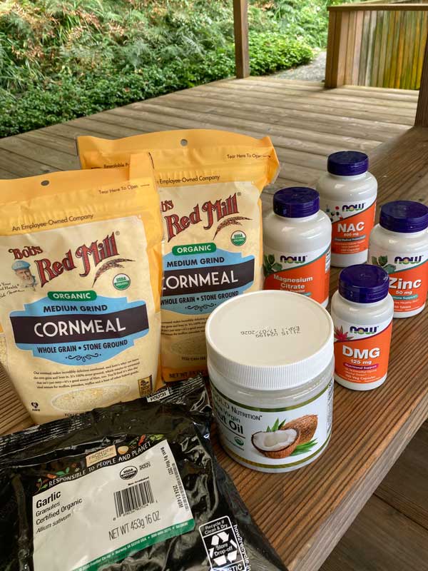そしてどうしても食べたかったものの材料、コーンミール、ココナッツオイル、顆粒状ニンニク。全部オーガニックです。
