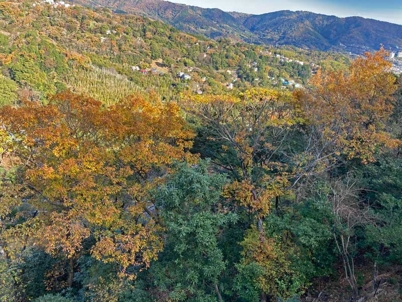 常緑樹に混じった落葉樹、紅葉と言うより茶褐色です