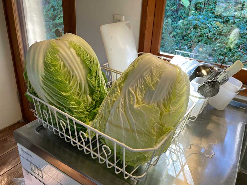 この秋は、配達をお願いしている安心食材のお店の白菜もスパーの白菜も何だか貧弱。立派な白菜があったので思わず2個買ってしまいました。鍋料理や即席の白菜づけに活躍しそうです。