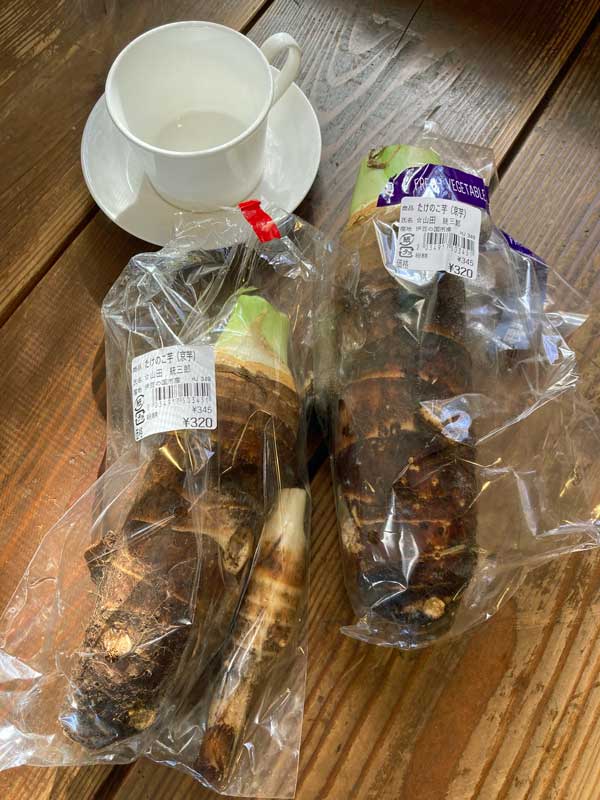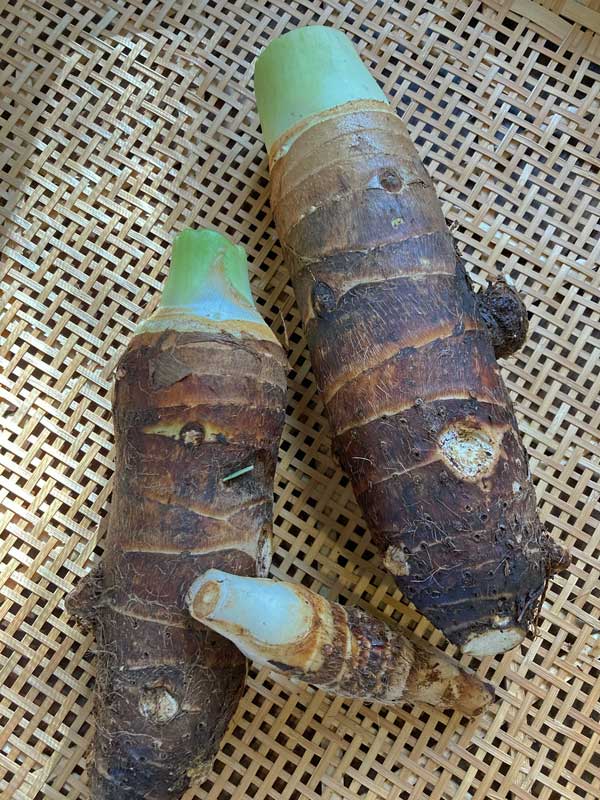 たけのこ芋は京いもとも呼ばれ、里芋の親芋を食べる品種。この日売られていたのは小さかったのですが、大きいのは直径5センチ長さ30センチくらいあります。